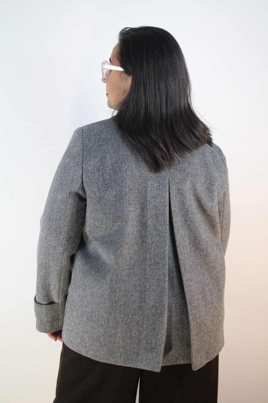 Cappotto in maglia grigio melange foderato all'interno. Collo a giacca, chiusura finto doppiopetto con bottoni color nero. Sfondo piega sul dietro, martingala sulle estremità delle maniche.
