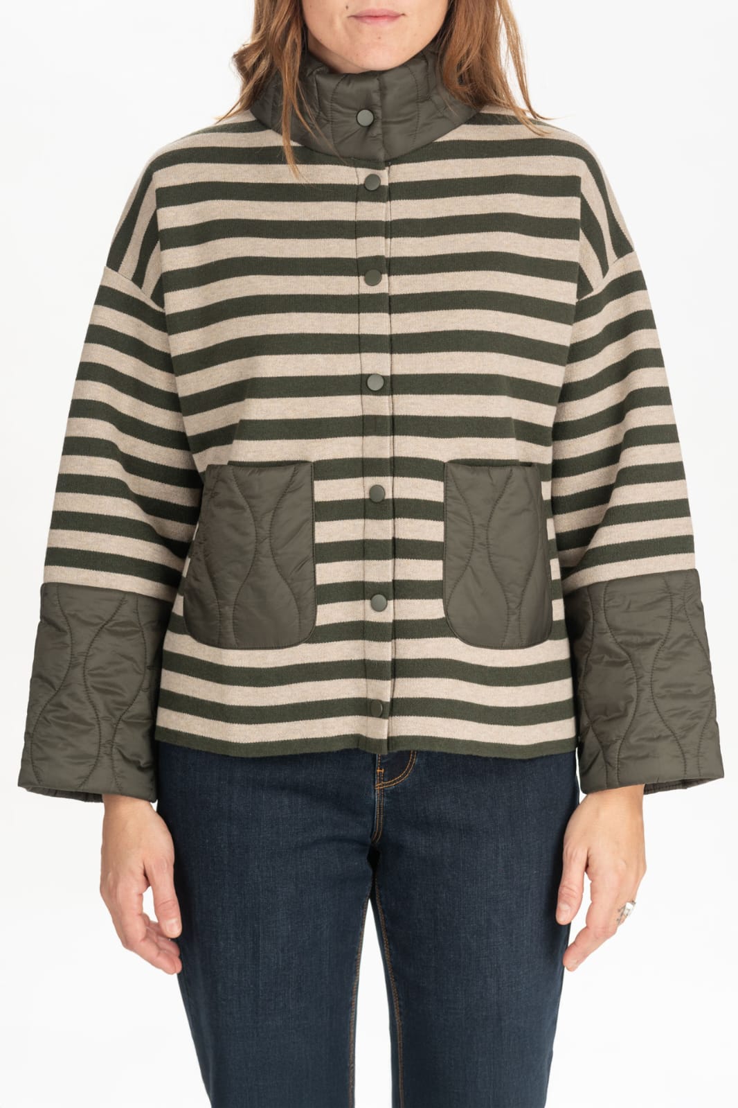 Giacca in tessuto maglia rigato beige e verde oliva con inserti piumino trapuntato sul collo alla coreana , fondo maniche e tasche applicate.