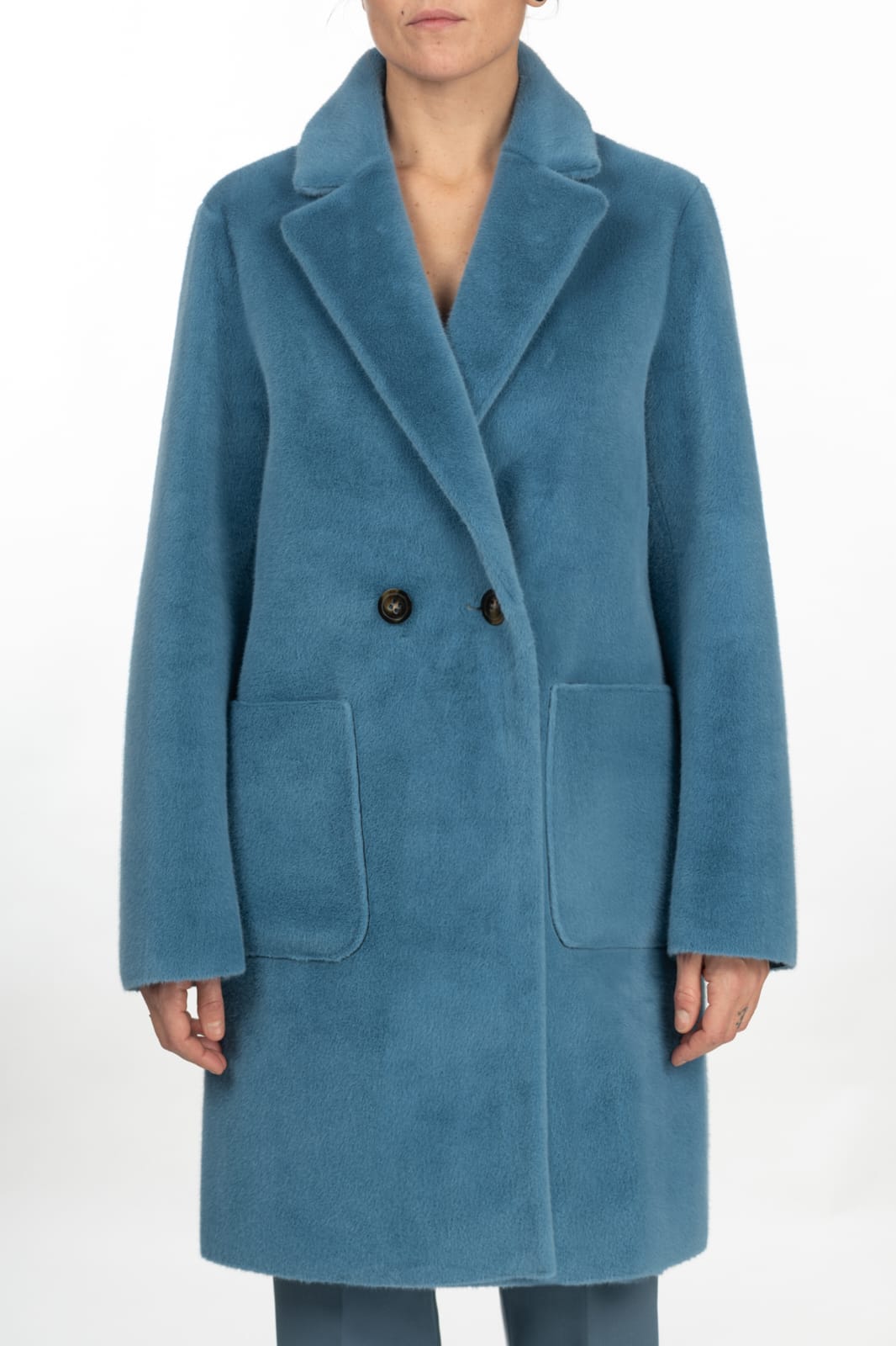 Cappotto color avio, lunghezza al ginocchio, tasche laterali, ecopelle azzurro all'interno. Chisura doppiopetto con bottoni neri.