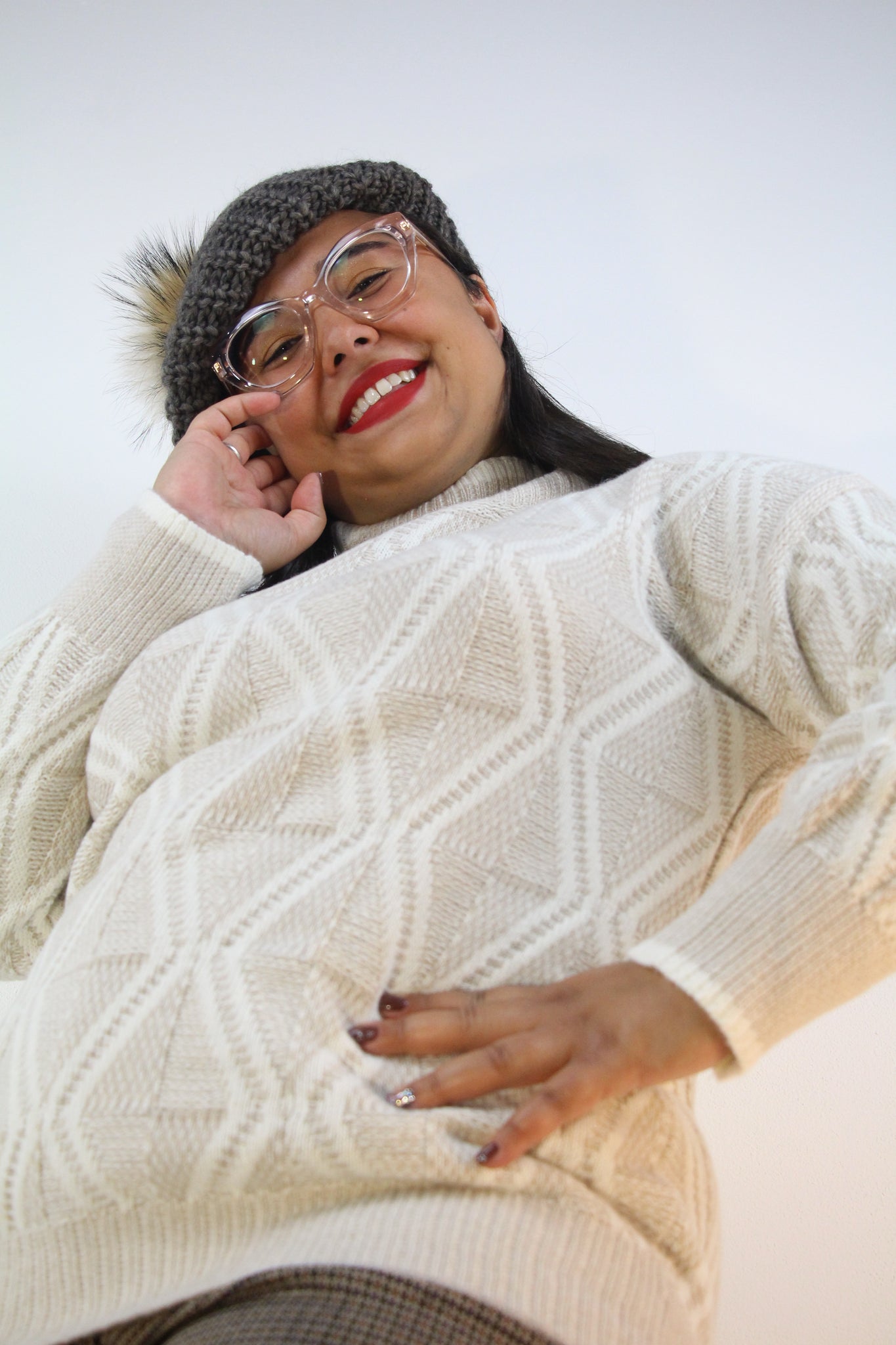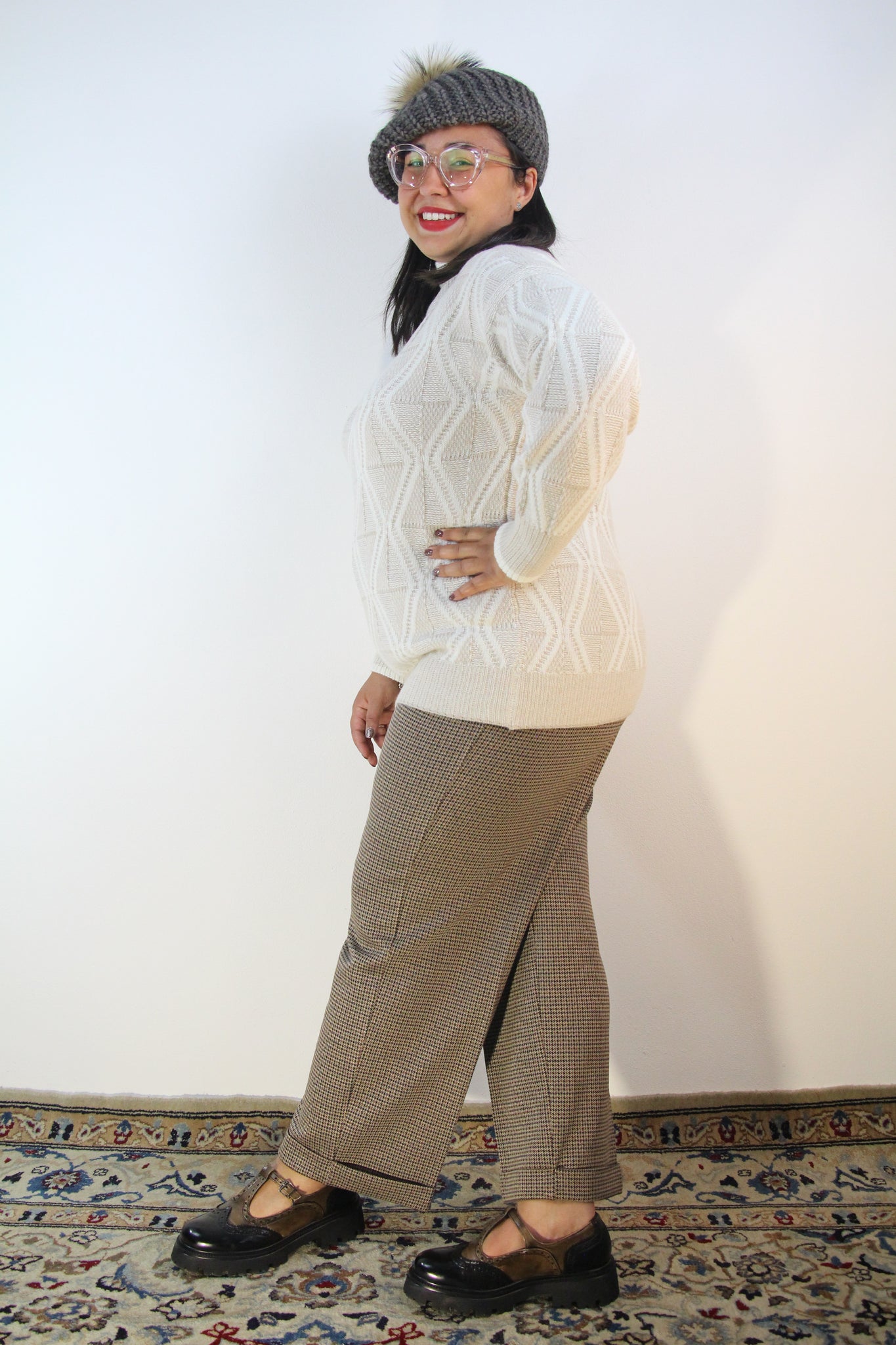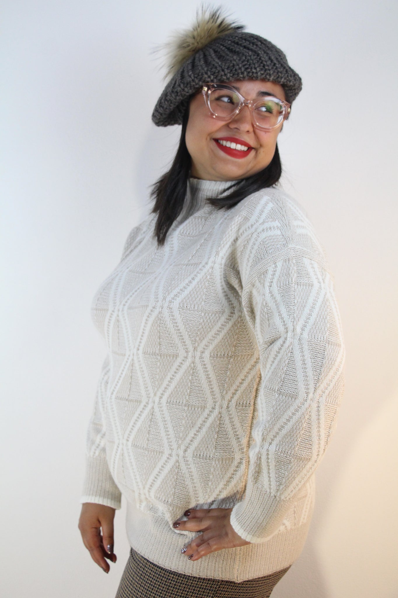 Maglia jaquart misto cashmere panna e bianco, collo ad anello morbido. Lavorazione maglia a rombi.