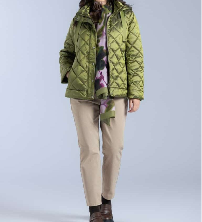 Giubbino verde olio in ecopiuma, cappuccio, chiusura con zip e automatici argentati. Vestibilità curvy